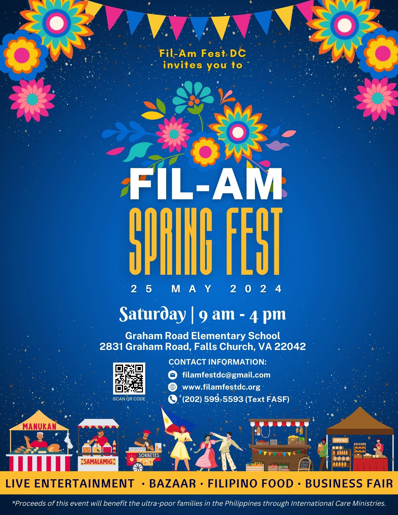 Sat, May 25, 2024 | Falls Church Live Entertainment| Bazaar| Filipino Food| Business Fair| Proceeds of this event will benefit the ultra-poor families in the Philippines through International Care Ministries | Time & Location May 25, 2024, 9:00 AM – 4:00 PMFalls Church, 2831 Graham Rd, Falls Church, VA 22042, USA