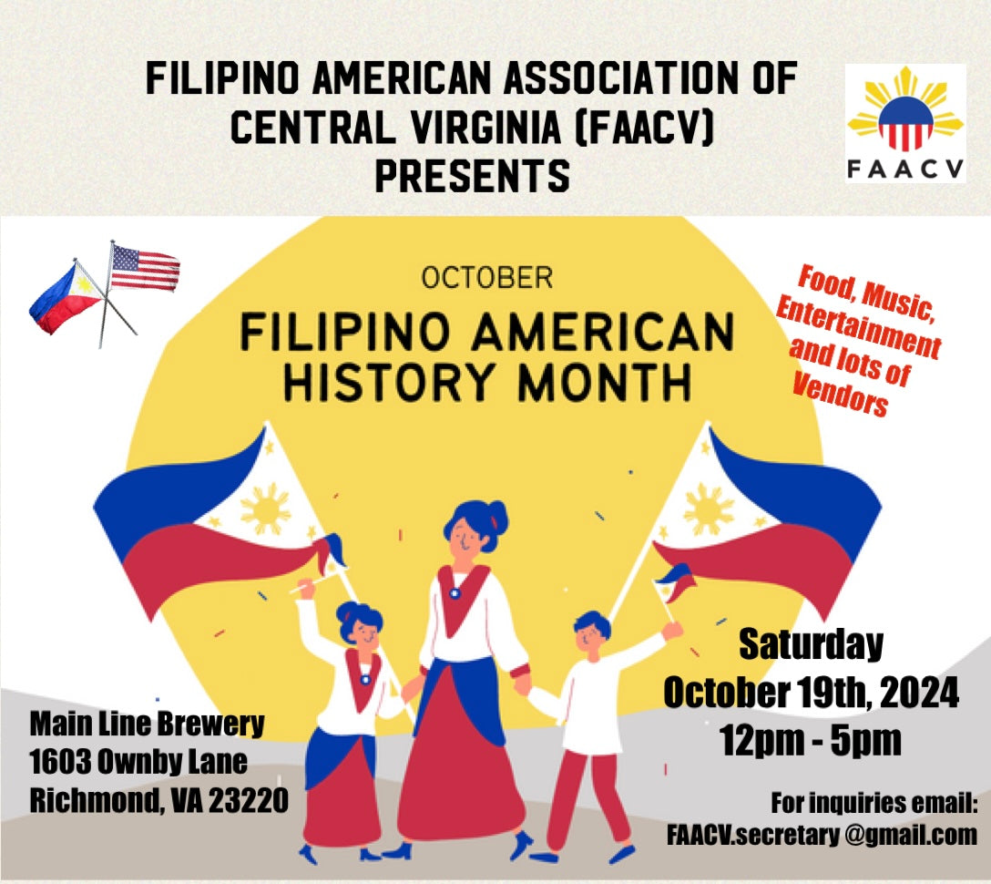Sat, Oct 19, 2024 | Richmond | Join us for a vibrant celebration of Filipino American History Month! Experience the rich culture with Filipino foods, music, entertainment, and vendors | Don't miss the opportunity to visit the I-Fern booth and discover our world-class products. | Time & Location | Oct 19, 2024, 12:00 PM – 5:00 PM | Richmond, 1603 Ownby Ln, Richmond, VA 23220, USA