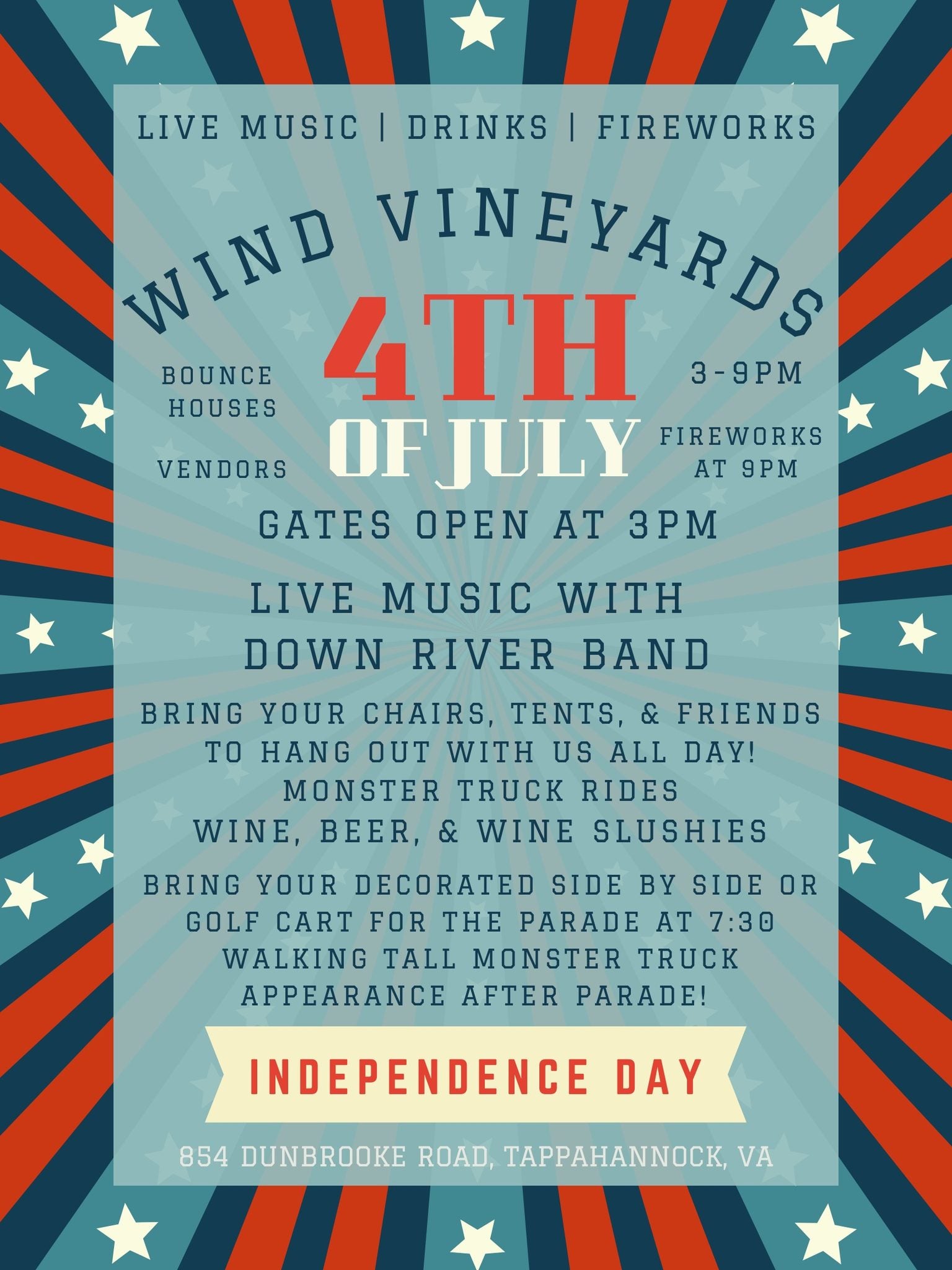 Thu, Jul 04, 2024 | Wind Vineyards at Laurel Grove Celebrate the 4th of July with I-Fern Distributor USA, LLC at Wind Vineyard! Stop by our booth and explore our health and wellness products. | Make this Independence Day a memorable one! | Time & Location | Jul 04, 2024, 3:00 PM – 9:00 PM | Wind Vineyards at Laurel Grove, 5178 Richmond Highway, Tappahannock, VA